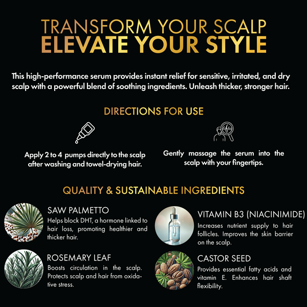 Transform your scalp, transform your style. This high-performance serum provides instant relief for sensitive, irritated, and dry scalps with a powerful blend of soothing ingredients. Support a healthy scalp environment, where rosemary oil (known for its potential in hair regrowth) can work its magic. Unleash thicker, stronger hair for a look that commands attention.